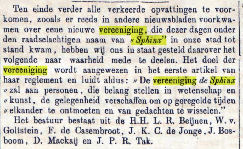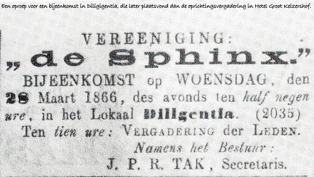 Op 7 maart 1866 werd in Den Haag door Donald Jacob Baron Mackay (1839-1921) de Vereeniging De Sphinx opgericht, in hotel Groot Keizershof op het Buitenhof.